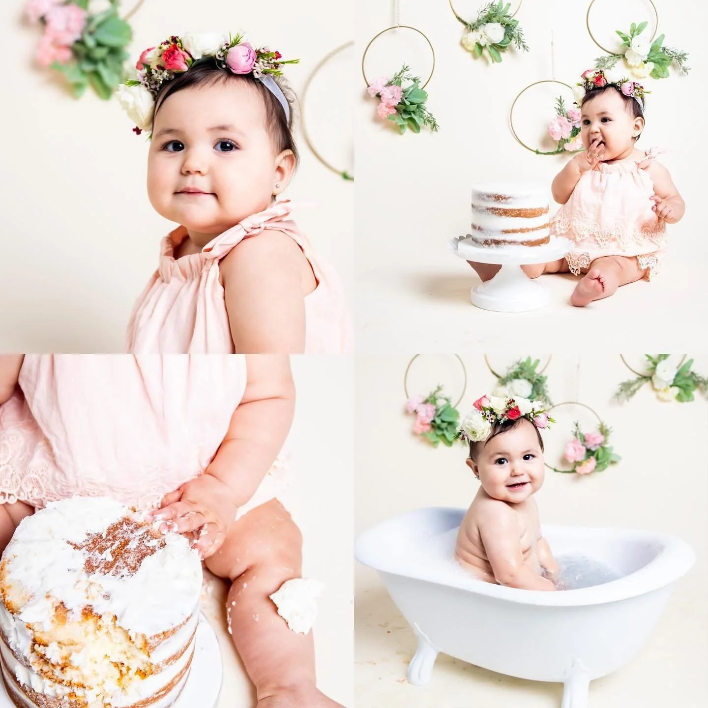 Cake smash sessions begin with simple, timeless portraits before moving into the cake smash portion and ends with a splash in a clawfoot bathtub.